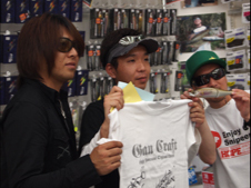 トークショーの後は、みなさんお待ちかね?の大抽選会。今回は、ガンクラフト製品だけではなく、「掛-Project」でもコラボレ ーションさせていただいた「釣りチチ渚」の単行本や、和歌山の名産品?なんかも登場。 |