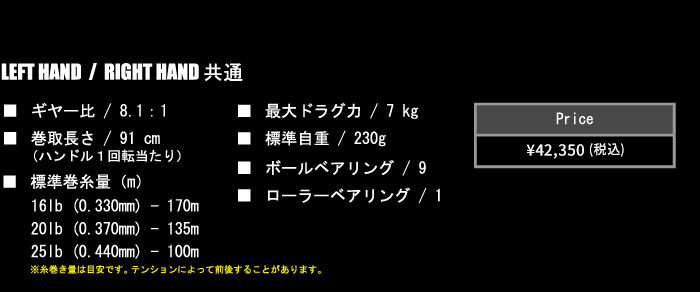 ビッグベイトやジャイアントベイトを用いたゲームで必要不可欠となる、25lb - 100Mの大容量ラインキャパシティー。さらにジョインテッドクローを流れの中で操作するうえで重要な素早い巻取りや、アクション後のラインスラッグの素早い巻取りからのフッキングをカバーするギヤ比 8.1:1(ハンドル1回転あたり91cm巻取り)のスーパーハイギヤを搭載。とことんタフにこだわり巨大なルアーを1日中キャスト&操作することができる、まさにモンスターとアングラーを繋ぐ大きな武器となる逸品です。